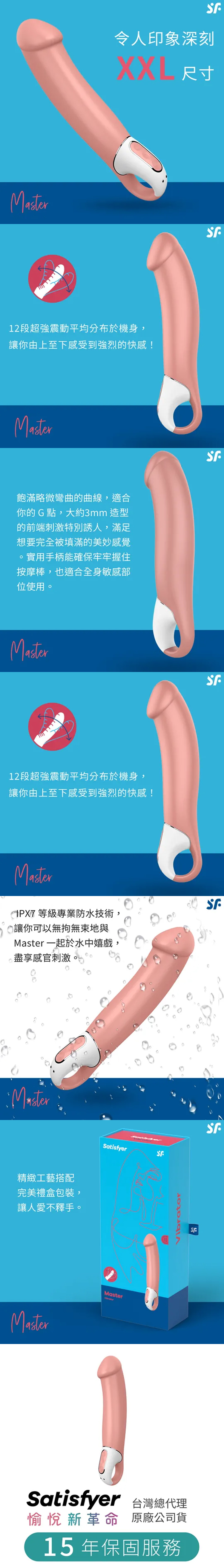 IPX7 等級專業防水技術,讓你可以無拘無束地與 Master 一起於水中嬉戲,盡享感官刺激。