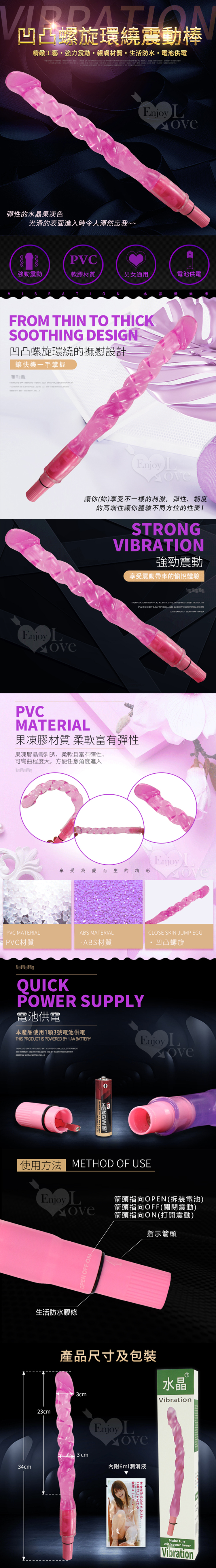 全長34公分的老二龜頭+棒身凹凸螺旋環繞設計,讓你(妳)享受異種的各種刺激,彈性、韌度的高端性讓你體驗不同方位的性愛!