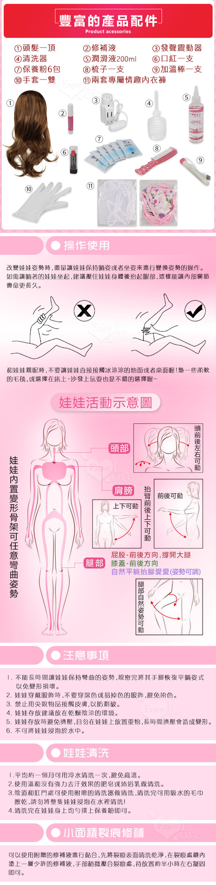 全實體高分子TPE(熱塑性彈性體)倒模而成,仿人體骨骼結構製作,內置合金骨骼關節可隨意調整及固定姿勢。