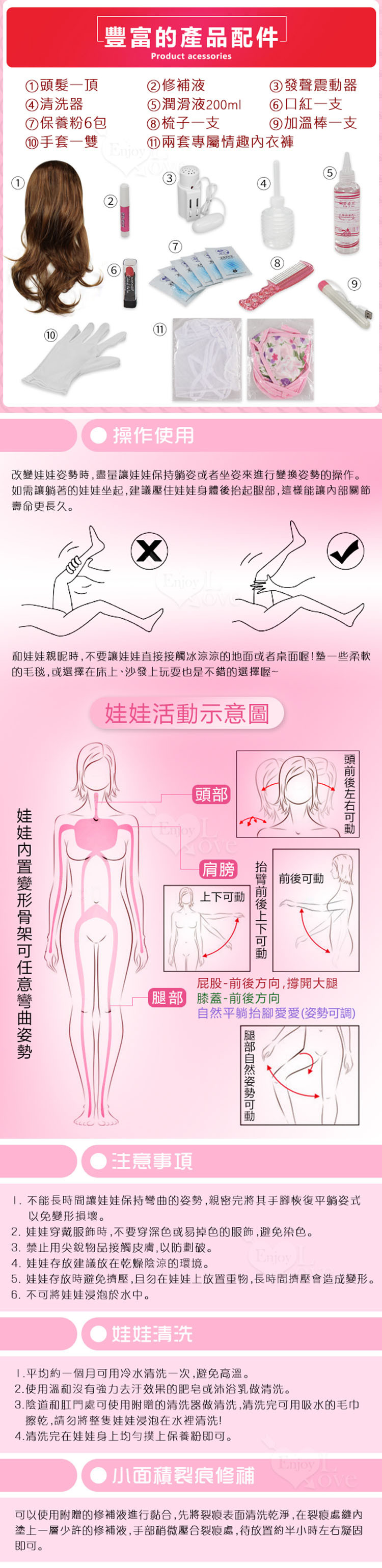 全身仿真人肌膚,紋理清晰、觸感柔滑且逼真有彈性,讓你100%完全佔有她。