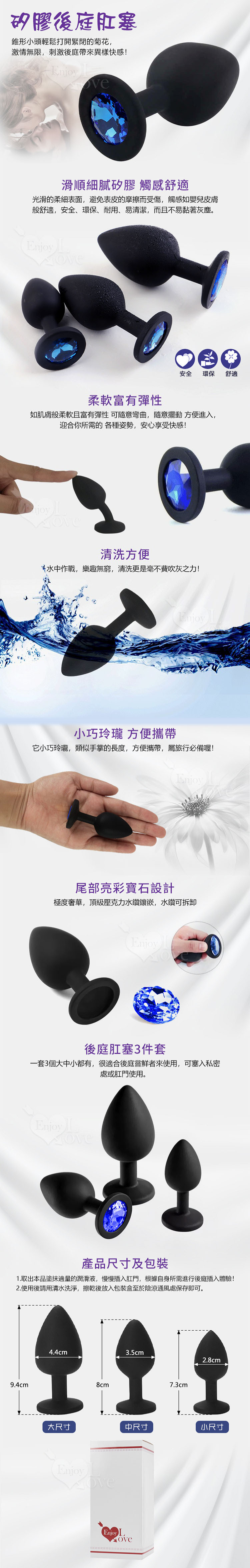 亮彩藍鑽滑順矽膠後庭肛塞 3件組