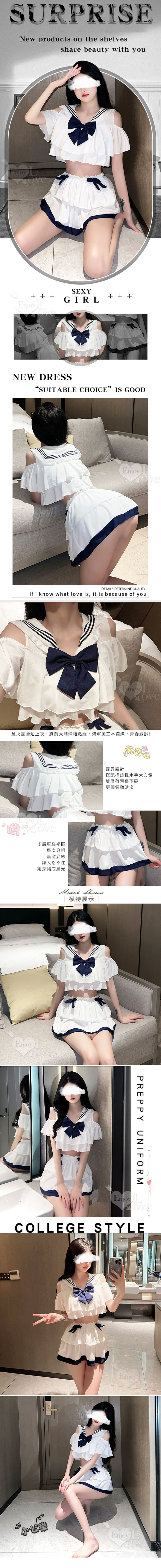 海軍水手服 露肩雙層荷葉邊短裙三件組套裝