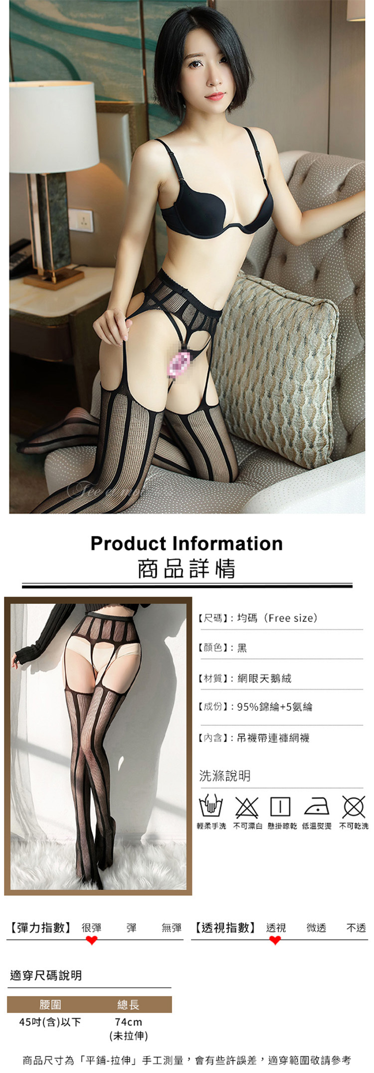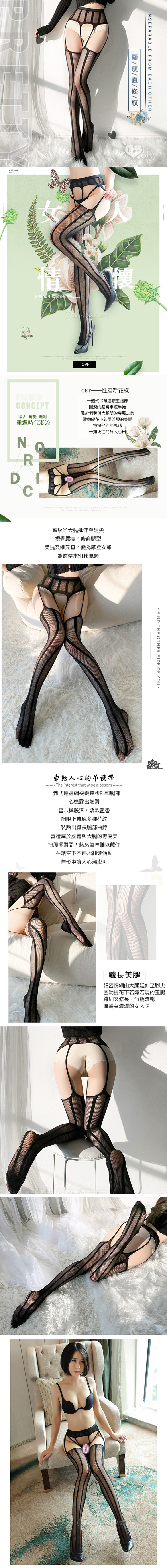 吊襪帶一體式貼合曲線連褲網襪(顯瘦直條紋)
