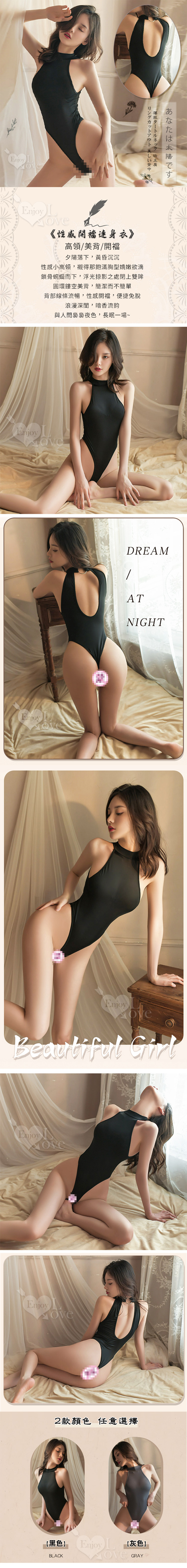 親膚高領削肩圓環鏤空美背高開衩開襠連身衣 (灰/黑)