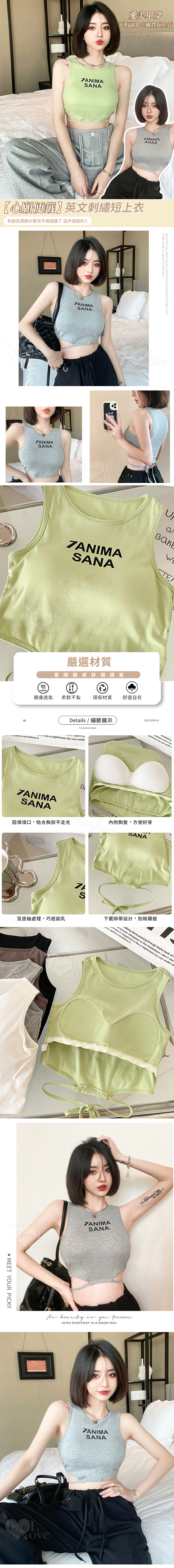 英文刺繡運動休閒背心短上衣 (灰色/綠色)