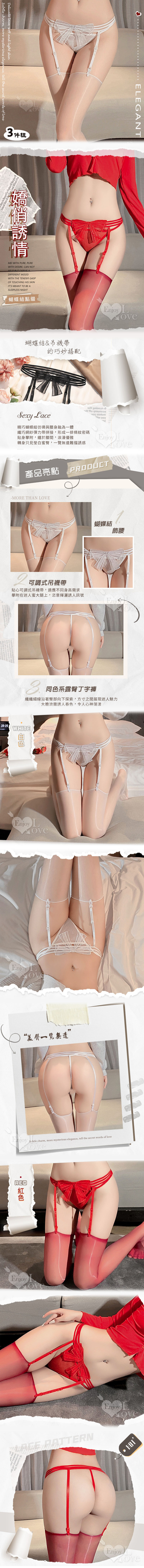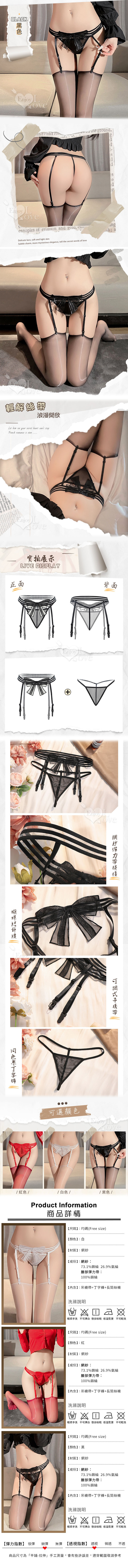 三件式網紗拼接蝴蝶結油亮吊帶長筒絲襪 (含褲)