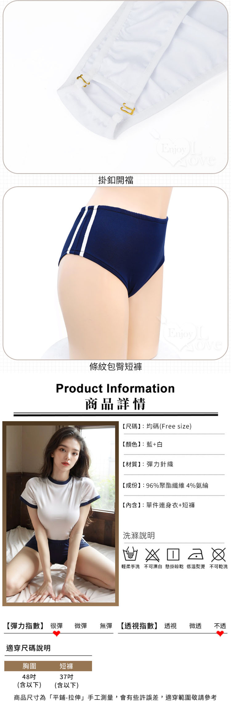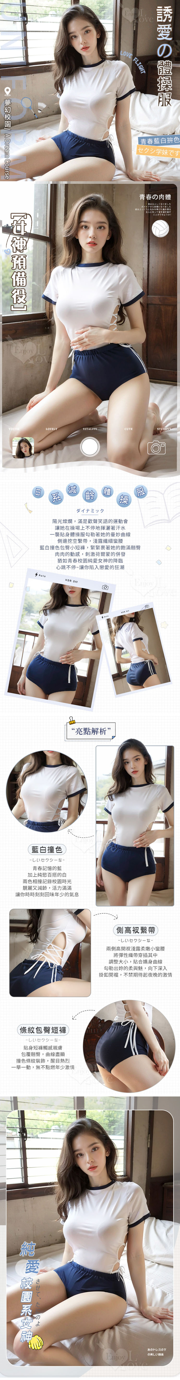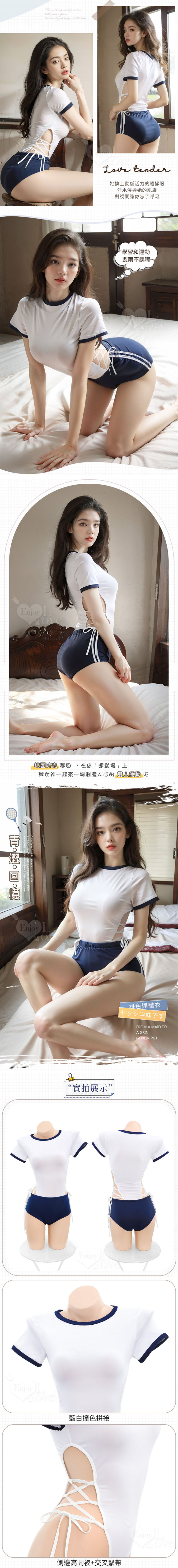 學生運動服 兩件式腰間高衩綁帶開襠連身衣 藍白