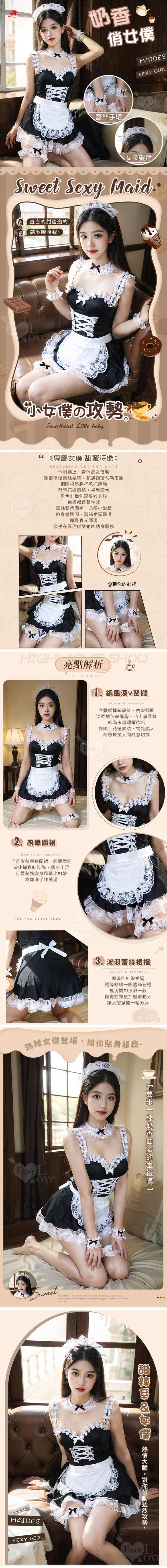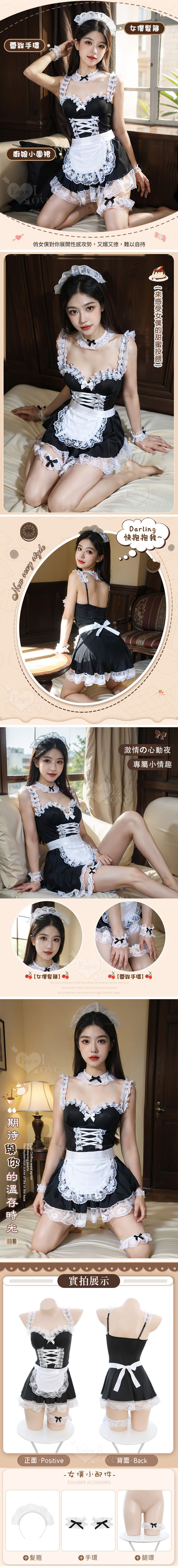 女僕服 七件式滾邊蕾絲浪漫裙襬睡衣套裝 黑