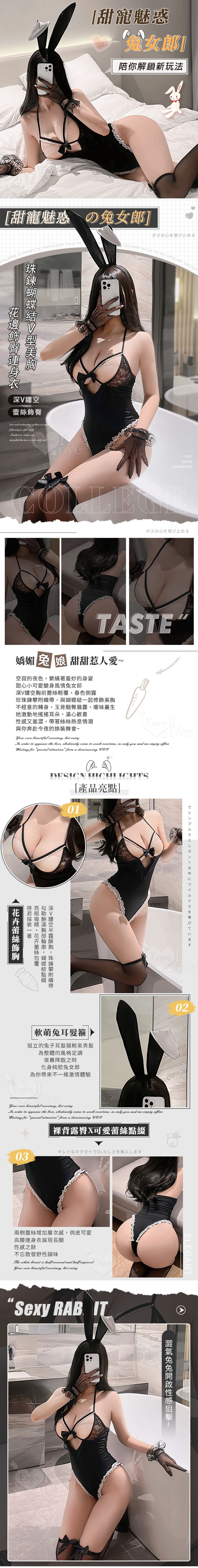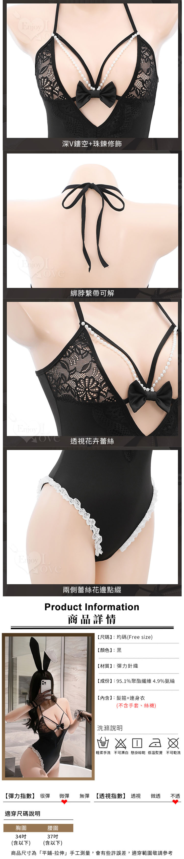 兔女郎 兩件式珠鍊V型露乳花邊飾臀連身衣 黑
