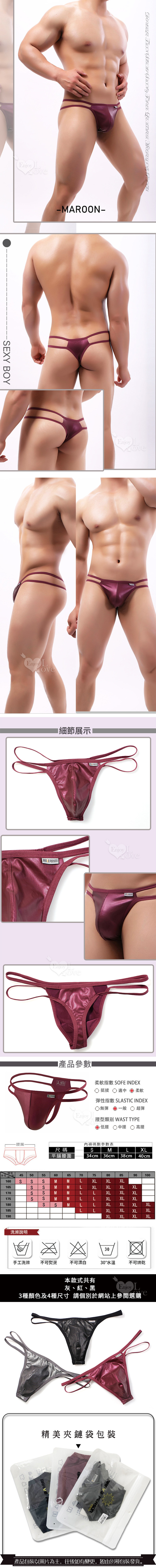 雙細帶激凸亮面仿皮男丁字褲 棗紅
