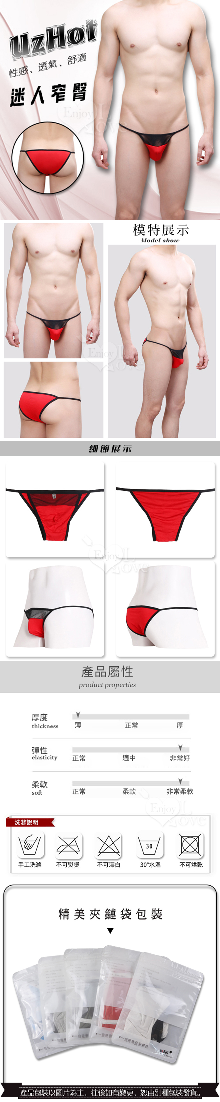 UzHot 迷人窄臀細帶網紗男三角褲 紅