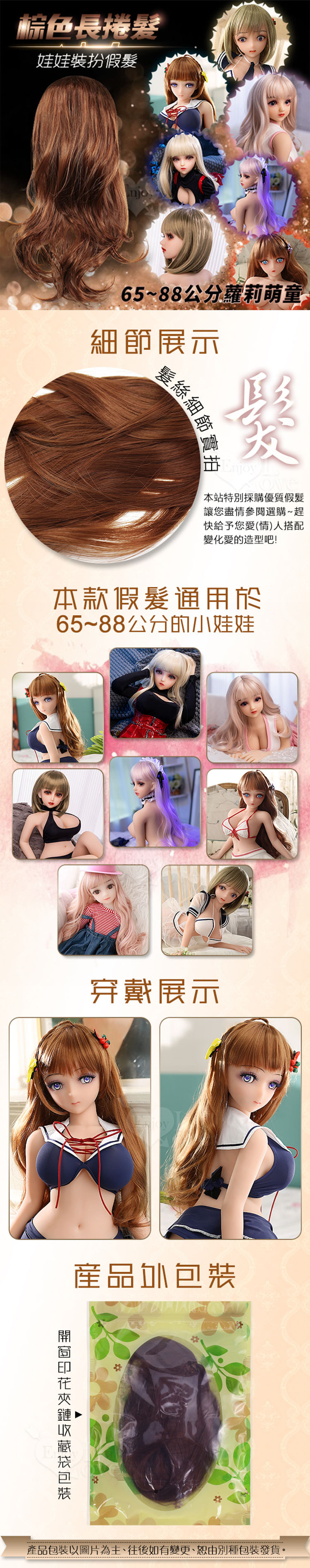 此款假髮通用於65~88公分的小娃娃頭圍上,盡情裝扮您的蘿莉愛娃,多款髮色請至本站選購。