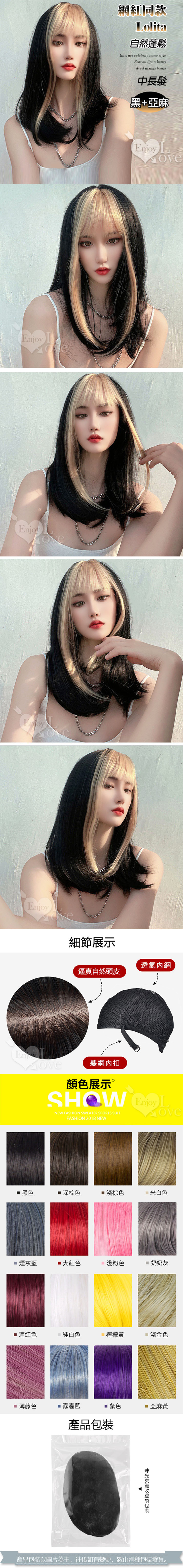 Lolita 網紅造型漫畫瀏海自然蓬鬆中長假髮 黑+亞麻