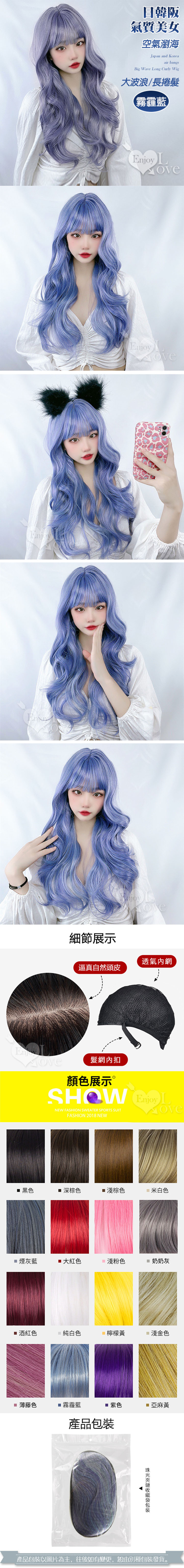 日韓阪空氣瀏海氣質美女大波浪長捲假髮 霧霾藍