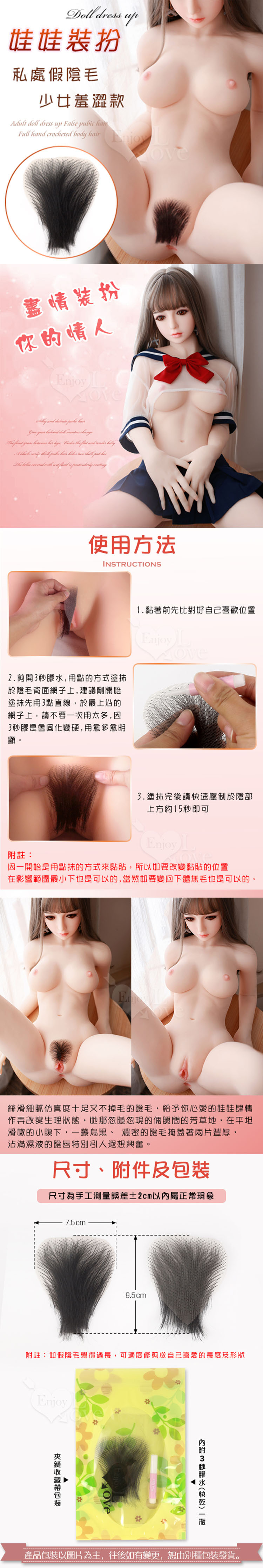 絲滑細膩仿真度十足又不掉毛的陰毛,給予你心愛的娃娃肆情作弄改變生理狀態,她那忽隱忽現的倆腿間的芳草地,在平坦滑嫩的小腹下,一叢烏黑、曲卷 、濃密的陰毛掩蓋著兩片豐厚,沾滿濕液的陰唇特別引人遐想興奮。