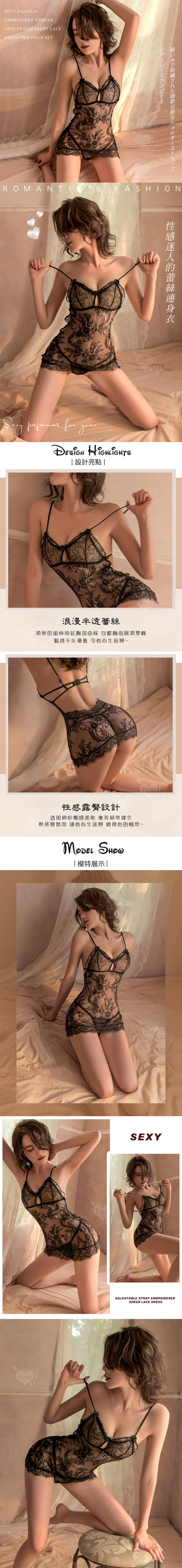 可調肩帶繡花細線薄透蕾絲連身裙睡衣兩件組