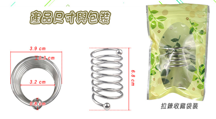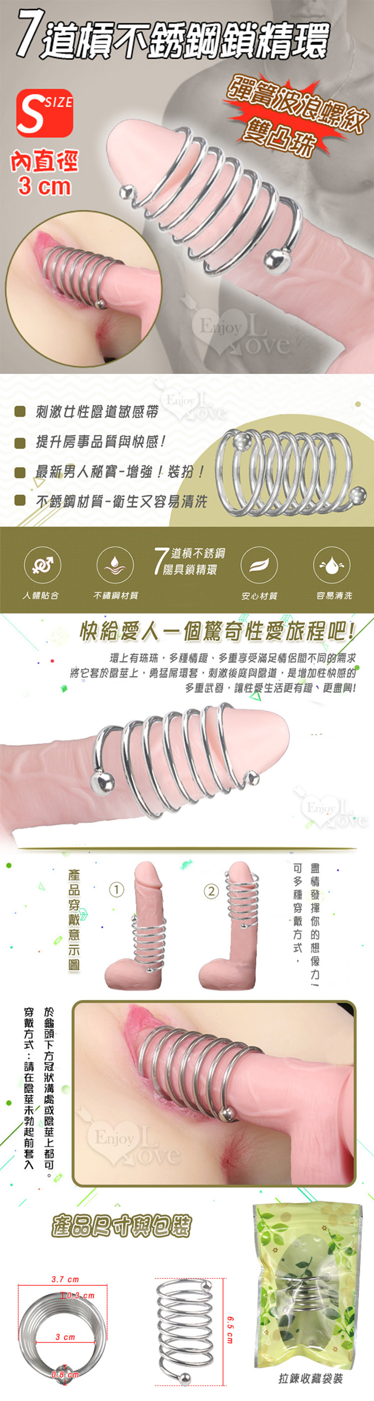 7道槓不銹鋼彈簧波浪螺紋雙珠刺激鎖精環 (S/M/L)