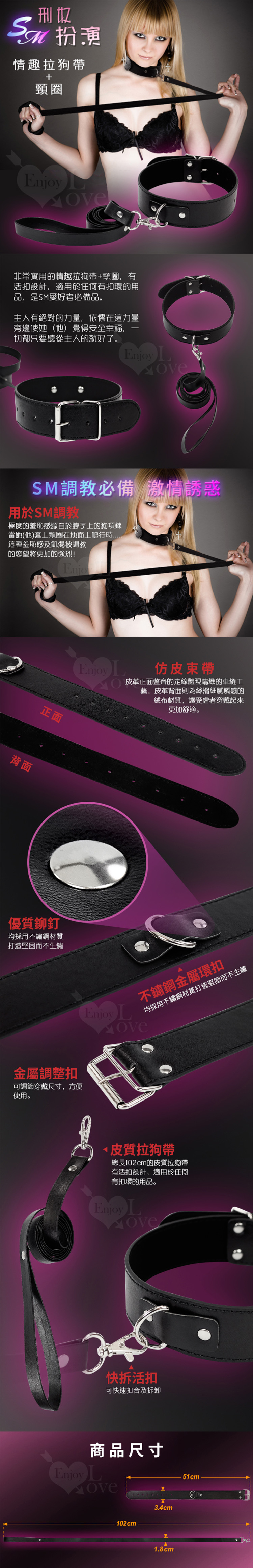 非常實用的情趣拉狗帶+頸圈,拉狗繩有活扣設計,適用於任何有扣環的用品,是SM愛好者必備品。總長102cm。主人有絕對的力量,依偎在這力量旁邊使她(他)覺得安全幸福,一切都只要聽從主人的就好了。