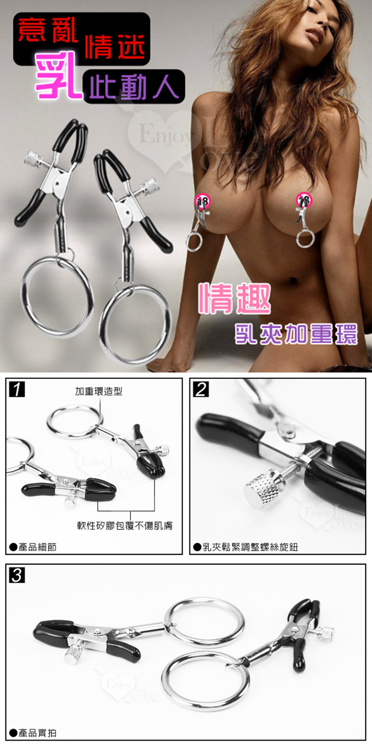 加重環上可以懸掛自己喜愛的物品,再運用兩個夾,夾在乳頭上,隨乳房的顫動,雙環在胸前的晃動,撩起無限情慾。