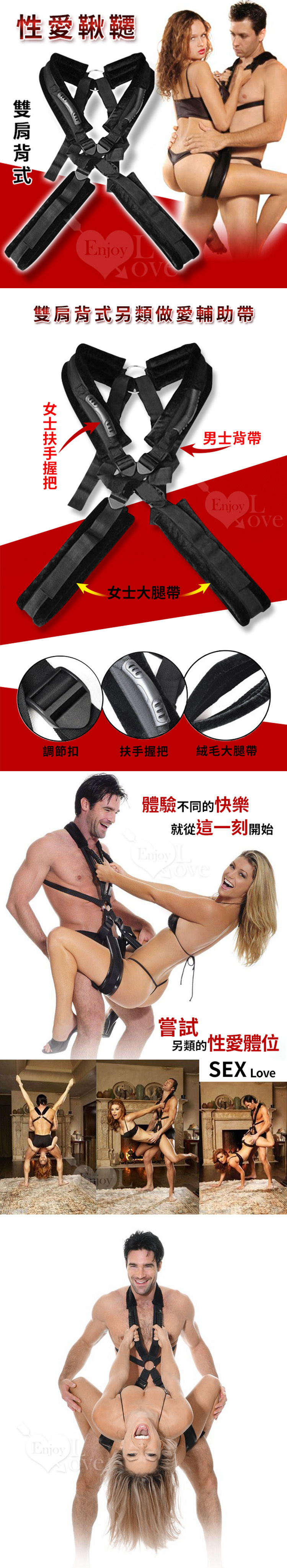 肩背式(站立式)輕鬆做愛鞦韆帶,本品由高強度尼龍帶製作,大腿和肩部都加有特製的皮革墊及塑膠條,讓您倍感舒適,站立式做愛,會帶給你和她全新的感受!