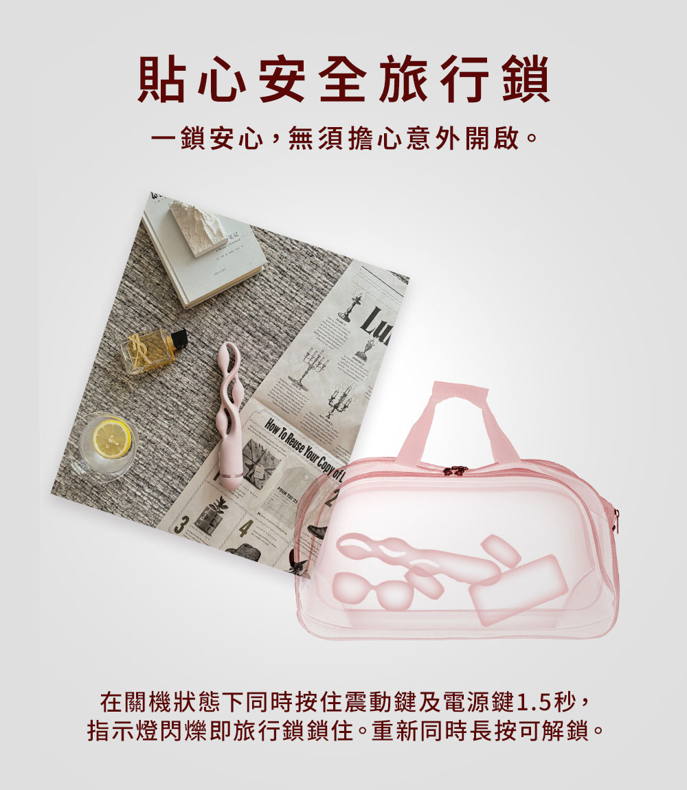 *在關機狀態下同時按住震動鍵及電源鍵1.5秒,指示燈閃爍即旅行鎖鎖住。重新同時長按可解鎖。