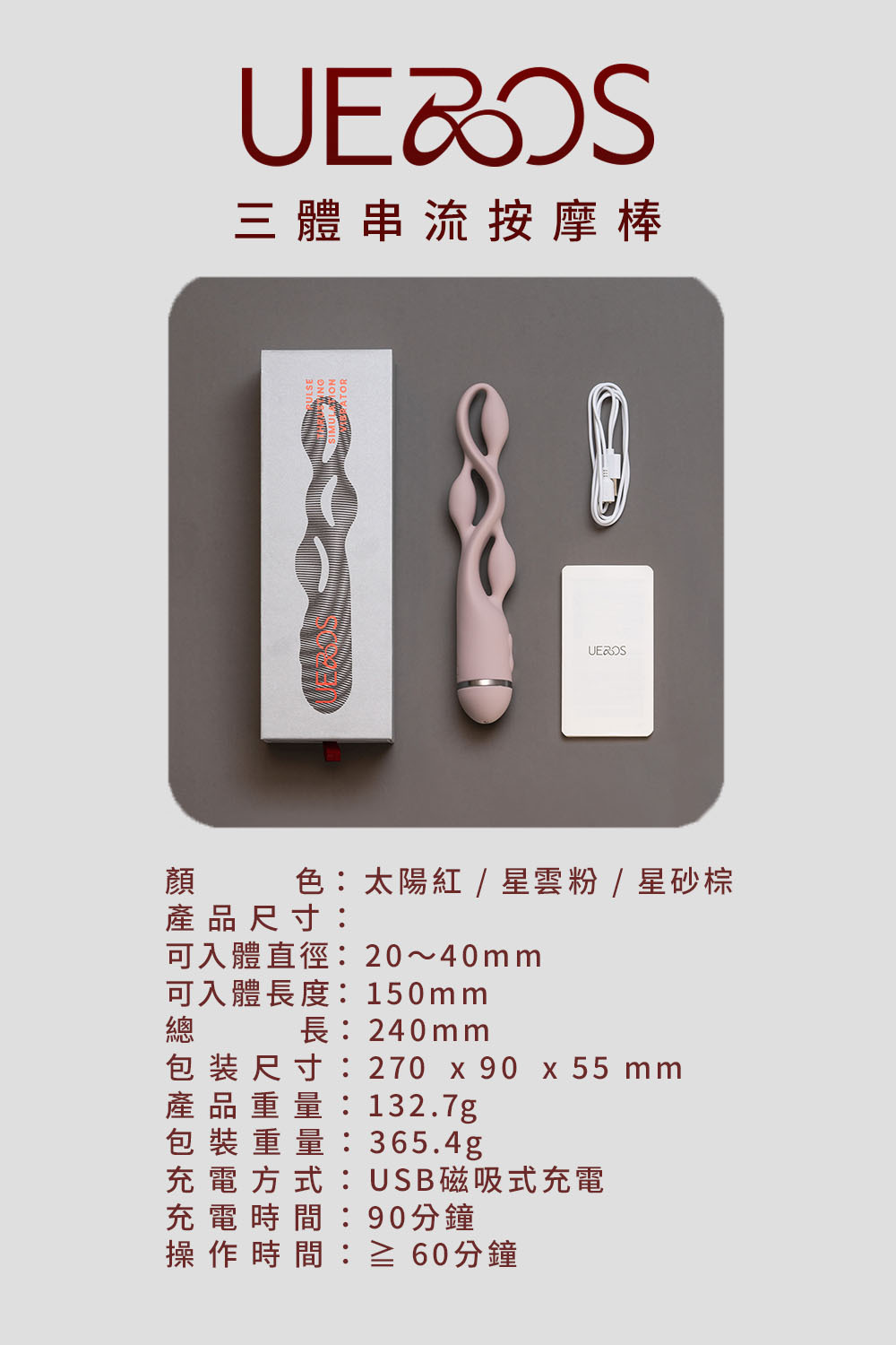 UEROS 流暢的高彈性壓縮結構,讓入體時輕鬆無壓力,入體後也沒有被漲滿的異物感。Delrin 頂級塑鋼可確保其柔韌性和耐用性,其出色的回彈性能在探索體內、外各種角度的同時,仍維持令人振奮的堅韌度。三體間較大的空隙讓震感更強烈,移動並旋轉棒體,讓多點、多向觸動每個敏感帶,即使最外的球體不入體,亦可向 C 點彎折緊貼刺激,盡享快感交替綿延的絕妙體驗!